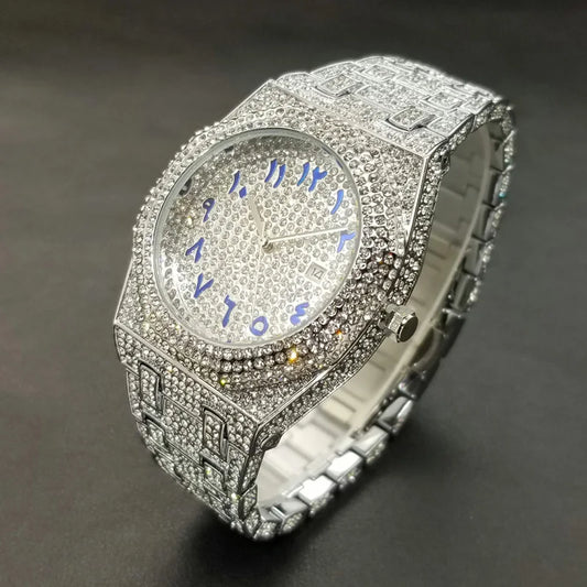 2023 New Arab Number Watch For Men Luxury Fully Diamond Bling Mens Quartz Watches Fashion Iced Out Silver Waterproof Male Clock
